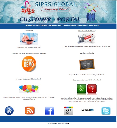 SIPSS-GLOBAL, Introducing Customer Portal for improving its interactions, and total Customer experience with us. Customers can get interacted with the right coordinates through this portal, able to express their experience feedback, complaints etc. Customer Satisfaction / Quality Assurance Cell of SIPSS-GLOBAL at HO will monitor this and take the necessary actions immediately.